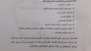 أعلن تجمع سائقي الشاحنات و البصات و اللواري السفرية دخول سائقي الشاحنات والبصات السفرية في ولايات السودان في إضراب شامل…