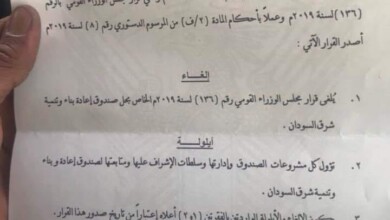 أصدر رئيس المجلس العسكري الإنتقالي الفريق أول عبدالفتاح البرهان قراراً القى بموجبة قرار حل صندوق إعادة بناء وتنمية شرق السودان…