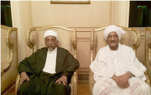 وظهر الميرغني -حسب صحيفة الصيحة يوم السبت – في صورة بمنزله بالقاهرة والذي يقيم فيه منذ عامين بعد عودته من العاصمة البريطانية لندن برفقة السفير عبد المحمود والوزير المفوض إدريس محمد علي.