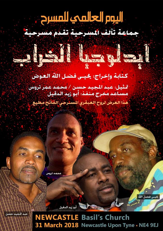 من تأليف واخراج الشاعر والقاص والكاتب المسرحي يحي فضل الله تقدم جماعة تآلف المسرحية عرضا مسرحيا بعنوان (آيدلوجيا الخراب) وذلك يوم السبت الموافق 31مارس بمدينة نيو كاسل ببريطانيا وذلك بمناسبة يوم المسرح العالمي ويشارك في التمثيل نخبة من المسرحيين المهاجرين وهم الفنانون محمد عمر ترويس و أبو زيد الدقيل وعبد المجيد حسن وتقدم مجموعة تآلف العرض المسرحي لروح المسرحي الراحل الفاتح مطيع.