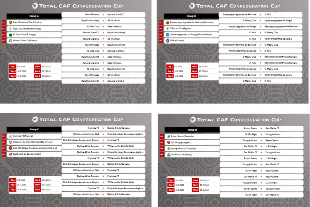وضمت المجموعة الأولى أسيك ميموساس العاجي والرجاء المغربي وادونا النيجيري وفيتا كلوب الكونغوليـ، بينما جاءت المجموعة الثالثة انيمبا النيجيري وويليام سفايل من ساحل العاج، وايغلونس الكونغولي وجوليبا المالي، وضمت المجموعة الرابعة اتحاد العاصمة الجزائري ورايون سبورت الرواندي، والشباب التنزاني وقورماهيا الكيني.