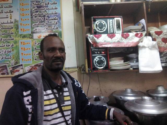تقلية، نعيمية، بامية، خضرة، فول مصلح، بيض بالطوة، طعمية، ويكة، عصيدة، ملاح روب قراصة وكسرة ولحمة سودانية شية، كباب تلك وغيرها كثير من أصناف الطعام السوداني التي يجهزها سودانيون يعملون بالمطعم الأشهر بحي عابدين في القاهرة…