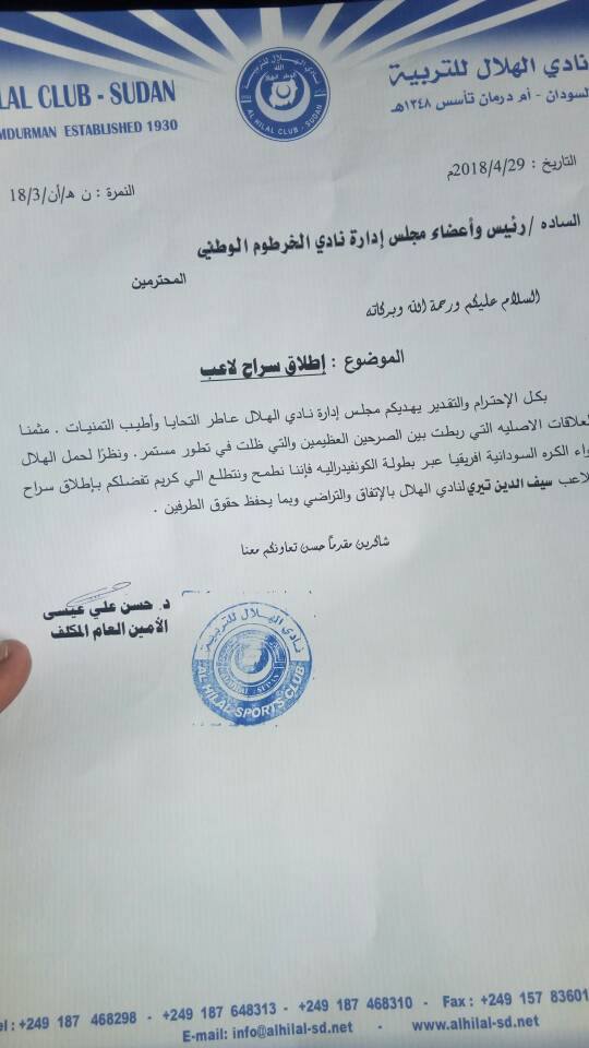 دفع مجلس إدارة نادي الهلال بخطاب رسمي ظهر اليوم الاثنين، إلى إدارة نادي الخرطوم الوطني، يطلب فيه خدمات المهاجم الدولي سيف تيري، للإستفادة منه في مجموعات الكونفدرالية، والتعاقد معه في التسجيلات التكميلية التي تنطلق في الخامس عشر من مايو المقبل للاعبين الوطنيين.