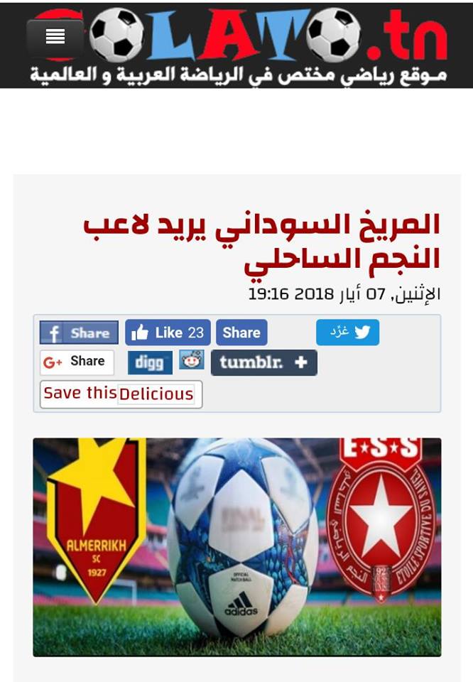 كشف موقع (غولاتو) التونسي أن إدارة المريخ وافقت مبدئيا على التعاقد مع مدافع فريق النجم الساحلي عمر كوناتي المالي الجنسية وأشار الموقع إلى أن احد وكلاء اللاعبين تحدث مع إدارة النجم عن إمكانية بيع اللاعب المريخ وتنتظر إدارة النجم التحرك الرسمي من إدارة المريخ لإكمال عملية بيع اللاعب وذكر الموقع أن كوناتي يعد من أفشل الصفقات التي عقدها النجم الساحلي قادما من نهضة البركان المغربي وكلف إدارة النجم مبلغا ضخما ولم يقدم فائدة للنادي منذ انضمامه في الصيف الماضي وأشار الموقع إلى ان نادي النجم يسعى للتخلص من اللاعب بأسرع فرصة ولن يتردد في إطلاق سراحه المريخ خاصة أن بقاءه يكلف النادي أموالا طائلة حيث انضم اللاعب للنجم بمبلغ 500 ألف يورو.