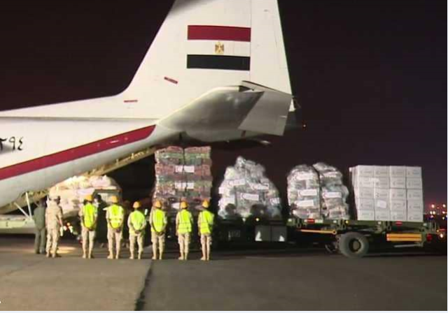 ونشر المتحدث العسكري المصري، الخميس، مقطعاً مصوراً يظهر مساعدات وزارات الدفاع والخارجية والصحة والتضامن الاجتماعي والزراعة، فضلاً عن معونات الهلال الأحمر المصري، المرسلة إلى السودان.