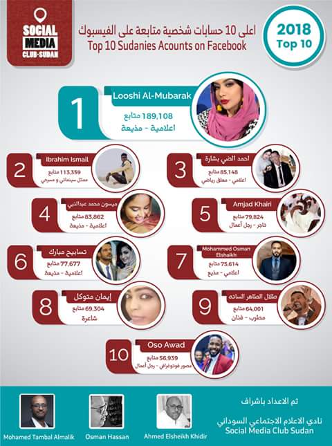 أعد فريق نادي الإعلام الاجتماعي السوداني قائمة بأعلى الحسابات السودانية من حيث عدد المتابعين على شبكة الفيس بوك.