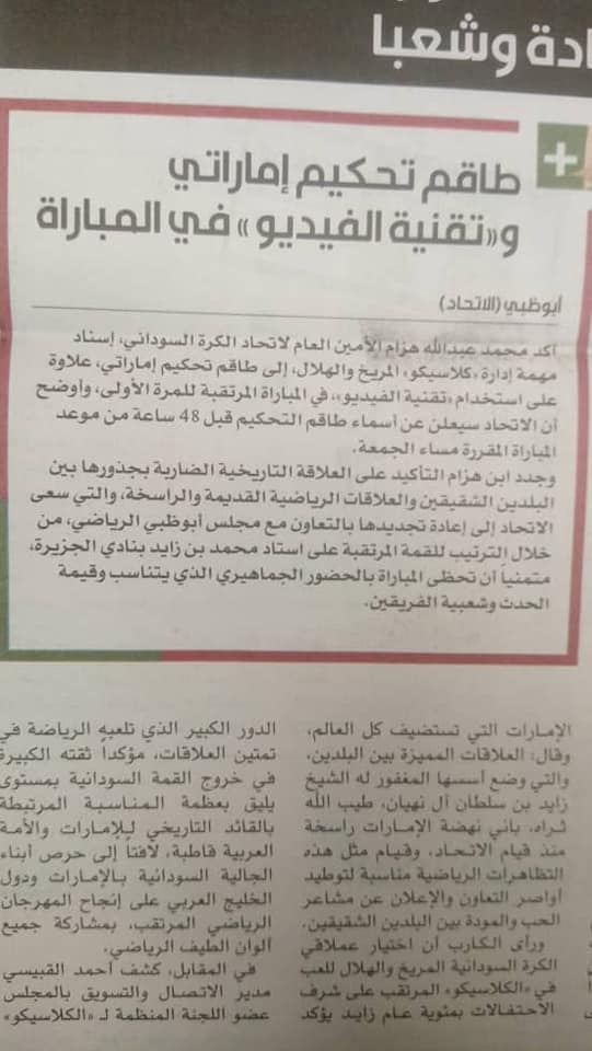 أبدت الصحافة الإماراتية اهتماماً كبيراً بديربي السودان الذي يجمع الهلال والمريخ في الثاني من نوفمبر المقبل، على شرف احتفالات(عام زايد) حيث أفردت صحف (البيان والاتحاد والرؤية والخليج) مساحة كبيرة للمواجهة وأجرت مقابلات مع ممثلي الهلال والمريخ ومتابعات تدريباتهما التي تقام على ملعب القوات المسلحة.