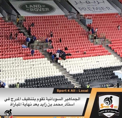 قامت جماهير الكرة السودانية بالإمارات عقب نهاية مباراة عملاقي الكرة السودانية الهلال والمريخ والتي جرت مساء الجمعة بملعب محمد بن زايد بأبو ظبي وكسبها الهلال بهدفين لهدف بتنظيف مدرجات الملعب في لفتة وجدت إعجاب الإماراتيين الذين تغزلوا في أخلاق السودانيين وجماهيرهم بعد مشاهدة الصورة.