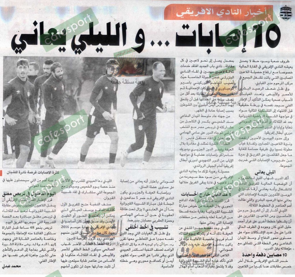 أعلنت الصحافة التونسية الصادرة اليوم الأحد معاناة الأفريقي قبل مواجهة الهلال، الأربعاء المقبل في ذهاب دور الـ32 من دوري أبطال أفريقيا وأشارت صحيفة (الشروق) إلى أن المدرب شهاب الليلي في امتحان حقيقي بسبب موجة الإصابات التي ضربت صفوف الفريق و إبعاد خمسة لاعبين عن مواجهة شبيبة القيروان يوم الثلاثاء.