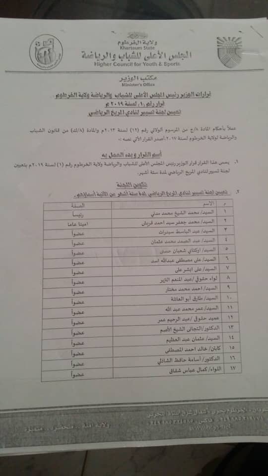 أصدر اليسع الصديق رئيس المجلس الأعلى للشباب والرياضة بولاية الخرطوم قراراً قضى بتمديد أمد مجلس المريخ الوفاقي لمدة ستة أشهر أخرى. حتى يتمكن من إجازة النظام الأساسي للنادي وتسيير أمور النادي الإدارية والمالية وأي مهام أخرى.