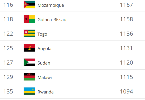 وتصدرت السنغال المنتخبات الأفريقية (24 عالمياً)، تونس ثانياً (28 عالمياً) المغرب ثالثاً (43 عالمياً) ونيجيريا رابعاً (46 عالمياً) والكونغو الديمقراطية خامساً (51 عالمياً).