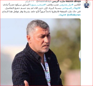 رد المدرب السوري نزار محروس، على نفي مجلس الهلال للتفاوض معه لخلافة التونسي اراد الزعفوري والإشراف على تدريب الفريق حيث رد برسالة بليغة عبر حسابه بموقع التواصل الاجتماعي (توتير) (عن بُعد.. السمعة الطيبة والصورة النقية لأي كيان يأبى البعض بسلوكه المريض إلاّ أن يُشوّههما لتظهر الحقيقة خلاف ذلك عن قُرب…. ليتها استمرت المسافة بعيدة !!!).
