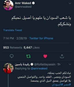 وكتب واكد على حسابه الشخصي بتويتر تغريدة قال خلالها: (ياشعب السودان ياملهم وأصيل…نحبكم ونشكركم)، هذا وقد وجدت تغريدة عمرو واكد تفاعل كبير جداً من السودانيين والذين علقوا عليها بحب وتقدير كبير تجاه النجم المصري.