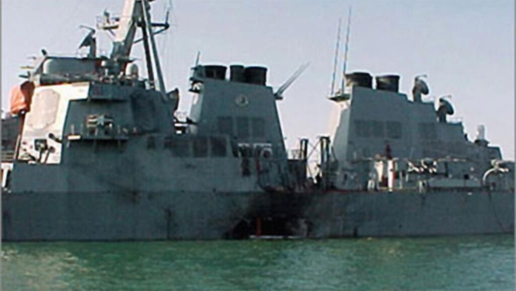 وكان الهجوم الذي وقع في 12 أكتوبر 2000 قد أسفر عن مقتل 17 بَحّاراً وإصابة أكثر من ثلاثين آخرين عندما قام رجلان على متن قارب صغير بتفجير مُتفجِّرات، إلى جانب مُدمِّرة الصواريخ المُوجّهة للبحرية بينما كانت تُزوّد بالوقود في ميناء عدن جنوب اليمن، مِمّا أدى إلى حدوث فجوة كبيرة في هيكلها، وتم إصلاح السفينة وعادت في وقتٍ لاحقٍ إلى الخدمة الفعلية الكاملة.