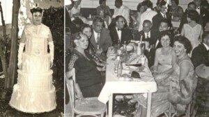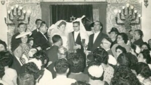 التقط هذه الصورة أحد ضيوف حفل زفاف هذا العريس، غابي تمام، على عروسه لينا إيليني في المعبد عام 1958، ويظهر فيها الحاخام الباز وهو يتلو مباركته ممسكا بكأس من النبيذ.