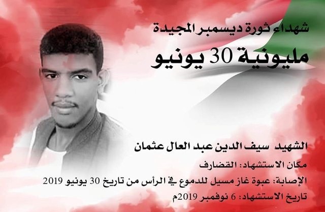 وبحسب آخر اصيب سيف تادين بعبوة غاز مسيل للدموع في الرأس أثناء مواكب 30 يونيو، بالقضارف. وظل يعاني من آثار الاصابة طوال الاشهر الاربعة الماضية الى ان انتقل الى الرفيق الاعلى صباح أمس الاربعاء.