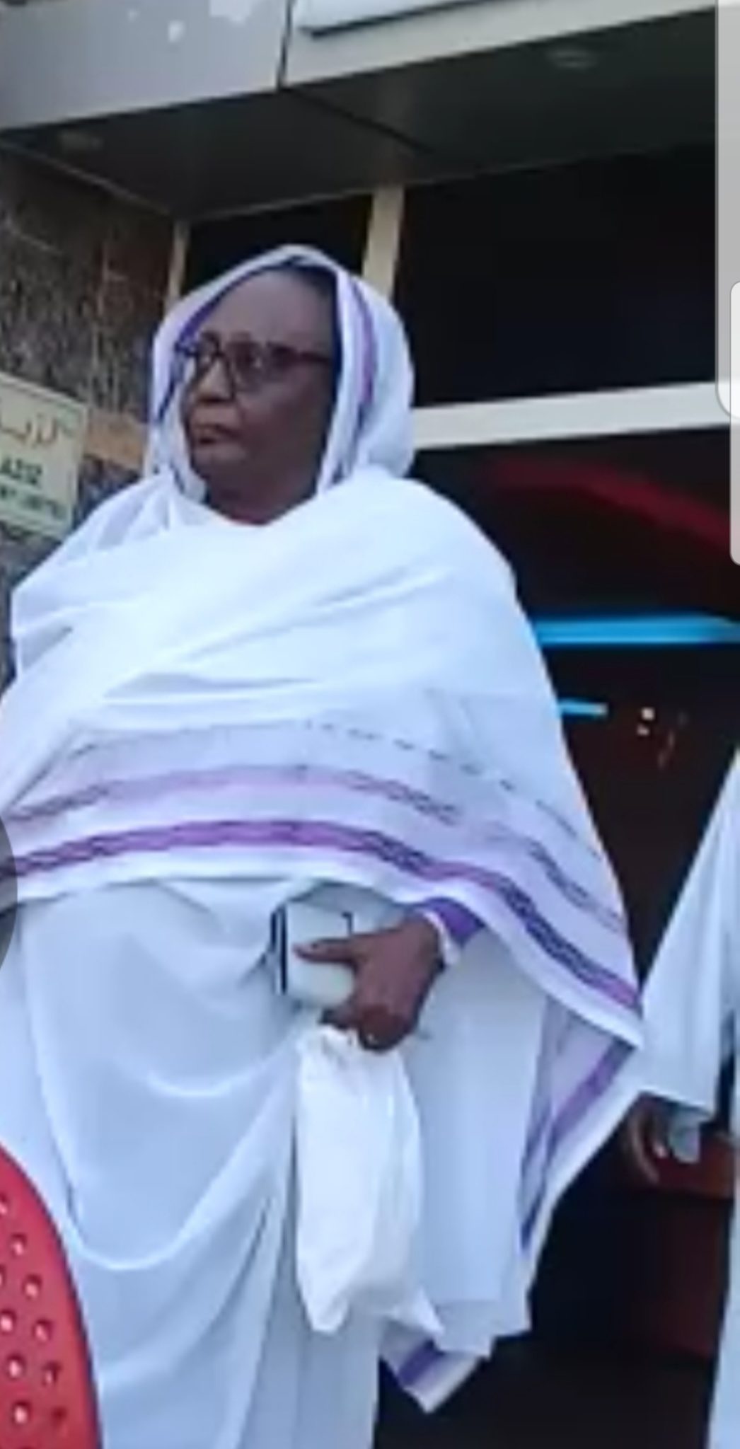 واظهر مقطع مدته أربع ثواني، الوزيرة وهي بثوب سوداني أبيض اللون تحمل ساندويتشات من مطعم “لذيذ” الواقع بالقرب من سكنها.