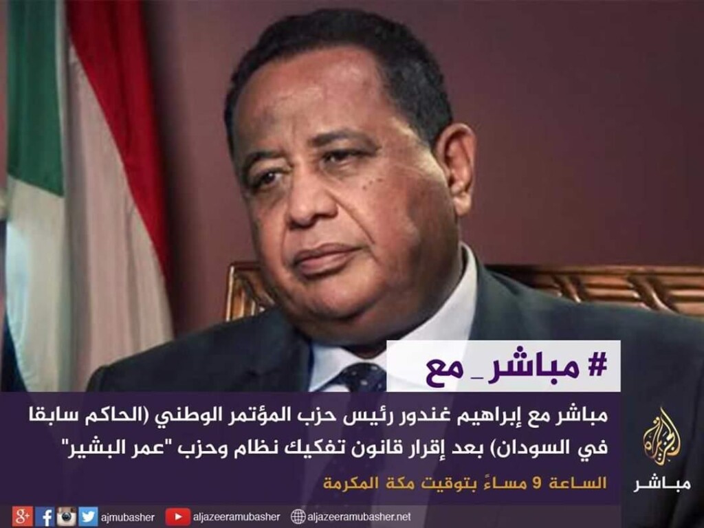 كشف إبراهيم غندور، رئيس حزب المؤتمر الوطني، في تصريح مفاجىء خلال لقاء اجرته معه قناة الجزيرة مباشر، مساء السبت (عن قانون حل حزب المؤتمر الوطني) الذي قال أنه جاء من الخارج، لكنه لم يسمي الجهة التي فرضته على مجلسي السيادة والوزراء.