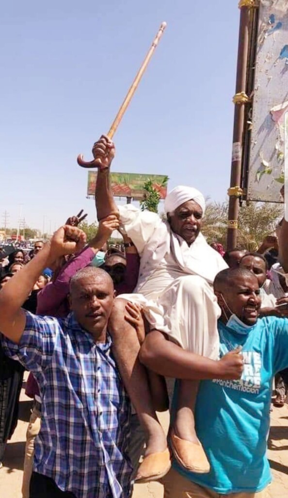 وظهر ” الأمين” في الصورة محمولاً رافعاً عصاته مبتهجاً، فيما بدأ مائلا بجسده للوراء، ب (نعله) الفاشري.