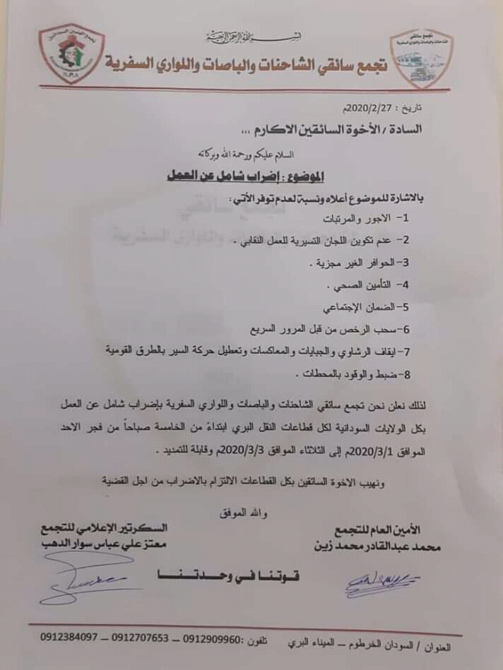 أعلن تجمع سائقي الشاحنات و البصات و اللواري السفرية دخول سائقي الشاحنات والبصات السفرية في ولايات السودان في إضراب شامل يستمر لثلاثة أيام ابتداءً من يوم أمس قابل للتمديد.