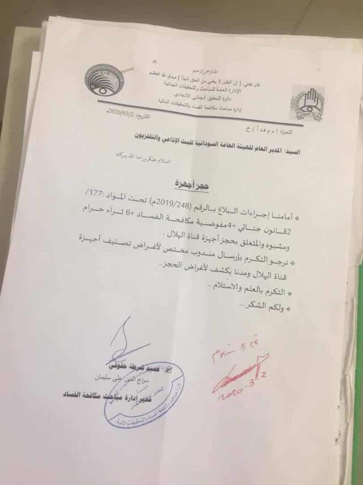 حجزت نيابة الفساد على ممتلكات قناة الهلال بحسب صحيفة اليوم التالى على خلفية بلاغ بخيانة الأمانة والثراء الحرام والمشبوه. الخرطوم ( كوش نيوز )