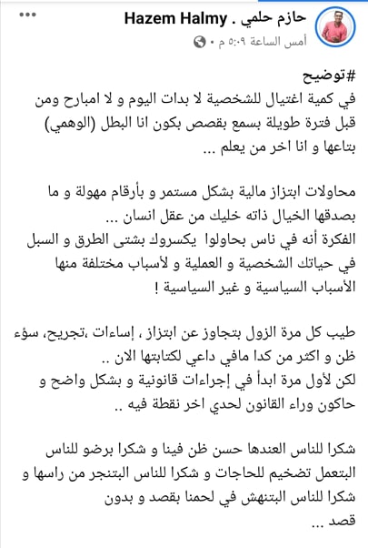 وتابع حلمي حديثه الذي تابعه المئات على عملاق مواقع التواصل فيسبوك: (طيب كل مرة الزول بتجاوز عن ابتزاز ، إساءات ،تجريح، سؤء ظن و اكثر من كدا مافي داعي لكتابتها الان ..