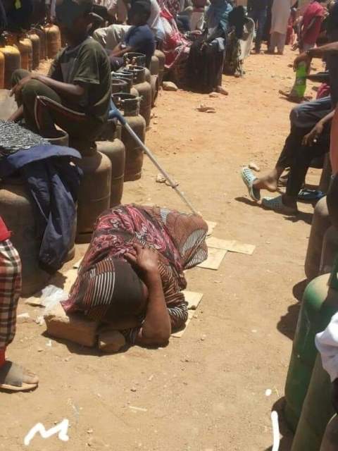 أشعلت يوم الأحد صورة لإمرأة سودانية السوشال ميديا، وهي مستلقية في الأرض على أوراق الكرتون متوسدة الحجارة في صف غاز طهي وعبرت الصورة عن حجم الأزمة الكبرى التي يعيشها السودان وتم تداول الصورة على كافة تطبيقات التواصل وصفحات التواصل الإجتماعي، وصاحبت الصورة تعليقات مختلفة مثل”أسفين يا أمي”، “متأسفين يا حاجة .. متأسفين”. ومن التعليقات على الصورة (يا حاجة آمنة إتصبري عارف الوجع في الجوف كتير عارفك كمان ما بتقدري!)