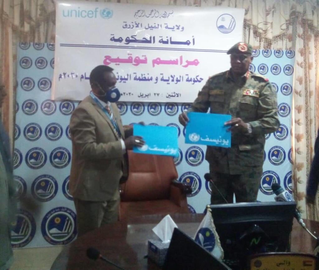 وقعت حكومة ولاية النيل الازرق ممثلة في اللواء الركن يس ابراهيم عبدالغني والي النيل الازرق المكلف والاستاذ خالد موسي مدير منظمة اليونسيف علي خطة عمل اليونسيف للعام 2020 بتكلفة اجمالية تبلغ. 8 مليون و723 الف دولار، وذلك اليوم بقاعة الامانة العامة لحكومة الولاية بحضور جلال الدين المنصوري امين عام حكومة الولاية وعبدالله علي فضل مفوض العون الانساني وعاطف محمد ابراهيم مدير عام وزارة المالية والقوي العاملة الوزير المكلف والعميد امن محمد الحافظ مدير المخابرات العامة بالولاية.