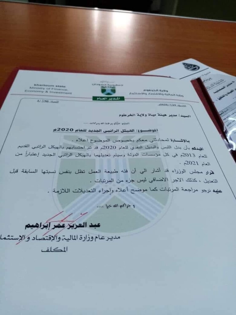 ووجه عبد العزيز في خطابه لمدير هيئة مياه ولاية الخرطوم، وفق صحيفة (السوداني)، بصرف بدل اللبس والبديل النقدي للعاملين وفقاً للهيكل الراتبي القديم للعام 2013.