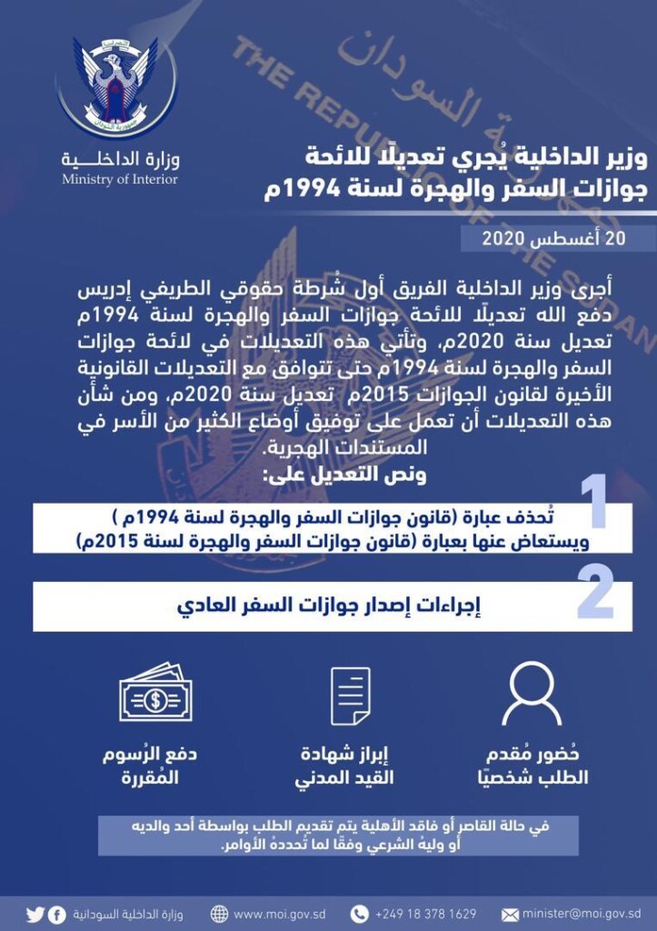 وقالت وزارة الداخلية في تعميمٍ صحفي اليوم الخميس وفق صحيفة السوداني ، إنّ وزير الداخلية الطريفي إدريس دفع الله، أجرى تعديلاً للائحة جوازات السفر والهجرة لسنة 1994 تعديل سنة 2020، وأشارت إلى أنّ التعديلات تأتي في لائحة جوازات السفر والهجرة لسنة 1994 لتتوافق مع التعديلات القانونية الأخيرة لقانون الجوازات 2015.