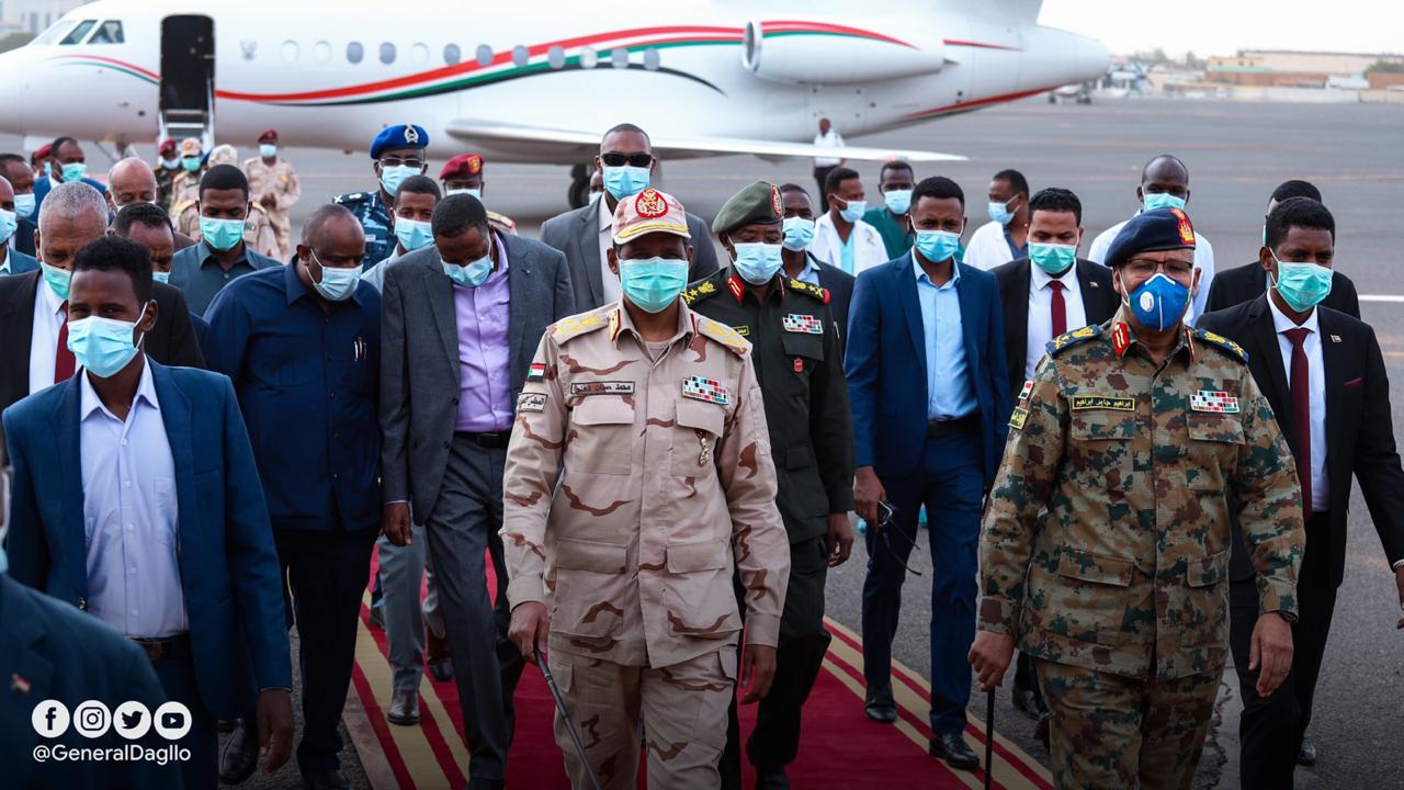 وصل البلاد عصر الخميس النائب الأول لرئيس مجلس السيادة الإنتقالي، رئيس وفد التفاوض الفريق أول محمد حمدان دقلو. وقال حميدتي في مؤتمر صحفي بمطار الخرطوم ان الإتفاق الذي تم التوصل إليه مع حركات الكفاح المسلح بجوبا، من أهم انجازات ثورة ديسمبر المجيدة، وهنأ الشعب السوداني على إنجازه.