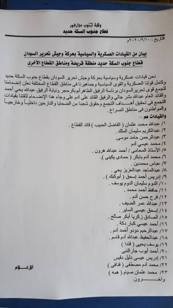 وأكدت القيادات العسكرية والسياسية بحركة وجيش تحرير السودان قطاع جنوب السكة حديد منطقة قريضة في (بيان)، وفق صحيفة (السوداني) ثقتهم في التجمع لتحقيق أهداف النضال الذي مهر بالدم والدموع، فضلاً عن تحقيق حقوق شعبهم من الضحايا والنازحين واللاجئين داخلياً وخارجياً والمواطنين في مناطق النزاع، فيما حمل البيان توقيع (23) من القيادات العسكرية والسياسية.
