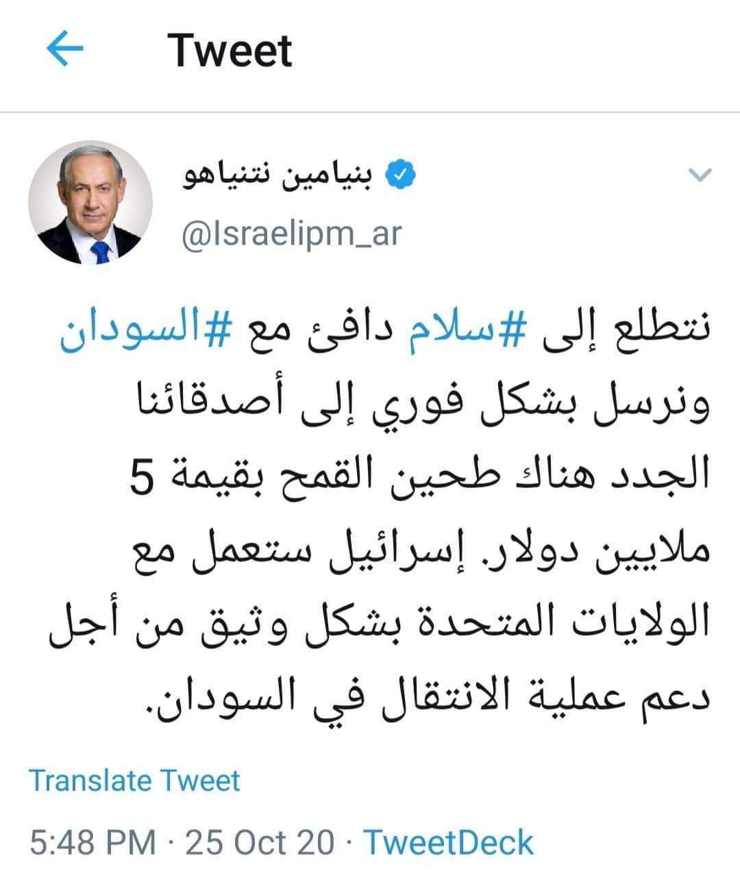 نتنياهو: نتطلع إلى سلام دافئ مع السودان، ونرسل بشكل فوري إلى أصدقائنا الجدد، هناك طحين القمح بقيمة 5 ملايين دولار. إسرائيل ستعمل مع الولايات المتحدة بشكل وثيق من أجل دعم عملية الانتقال في السودان.وفق صحيفة السوداني