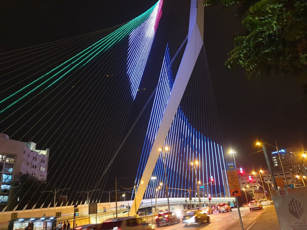 في حدث غير مسبوق تمت، إضاءة “جسر الأوتار” في مدخل مدينة القدس بألوان العلمين السوداني و الإسرائيلي، ابتهاجاً بالتطبيع وإنهاء حالة العداء مع السودان.