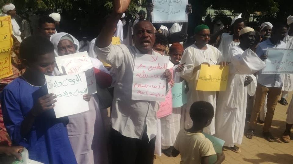 وما إن أنهى خطيب وإمام مسجد الأنصار آدم أحمد يوسف، نائب الأمين العام لهيئة شؤون الانصار، خطبة انتقد فيها خطوات التطبيع مع “دولة صهيونية غاصبة” حتى اصطف محتجون خارج المسجد العتيق حاملين لافتات تدين التطبيع.