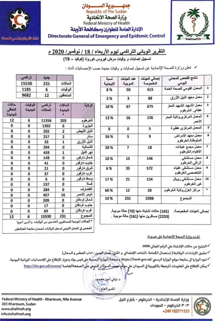 كشف التقرير الوبائي التراكمي ليوم الأربعاء 18 نوفمبر الصادر عن الإدارة العامة للطواري ومكافحة الأوبئة عن تسجيل (231) إصابة جديدة بكورونا وحالة و(6) حالات وفاة و(12) حالة تعافي.