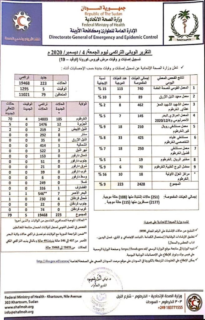 أعلنت وزارة الصحة الاتحادية عن تسجيل (223) حالة إصابة جديدة بفيروس كورونا المستجد بالاضافة الى تسجيل (79) حالة تعافي، و(5) وفيات وذلك حسب التقرير الوبائي للوزارة الصادر اليوم وفقا لنتائج الفحوصات والذي غطى يوم الجمعة الرابع من ديسمبر 2020 م.
