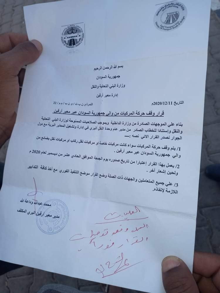 ونوه وفق صحيفة حكايات إلى أن القرار، صدر بناءً على التوجيهات الصادرة من وزارة الداخلية، على أن ينفذ القرار من تاريخ صدوره اليوم الجمعة. ونص القرار على وقف حركة المركبات سواءً كانت مركبات خاصة أو مركبات نقل ركاب أو مركبات نقل بضائع من وإلى جمهورية السودان عبر معبر أرقين.