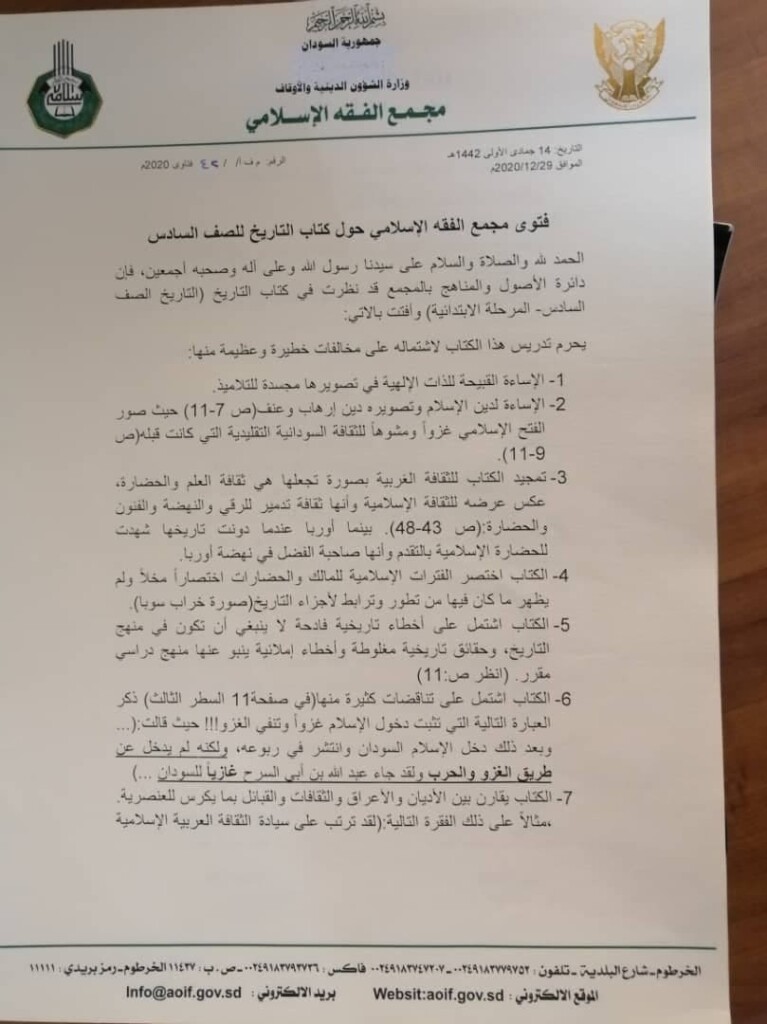أصدر مجمع الفقة الإسلامي، الثلاثاء، بياناً بتحريم تدريس كتاب التاريخ للصف السادس