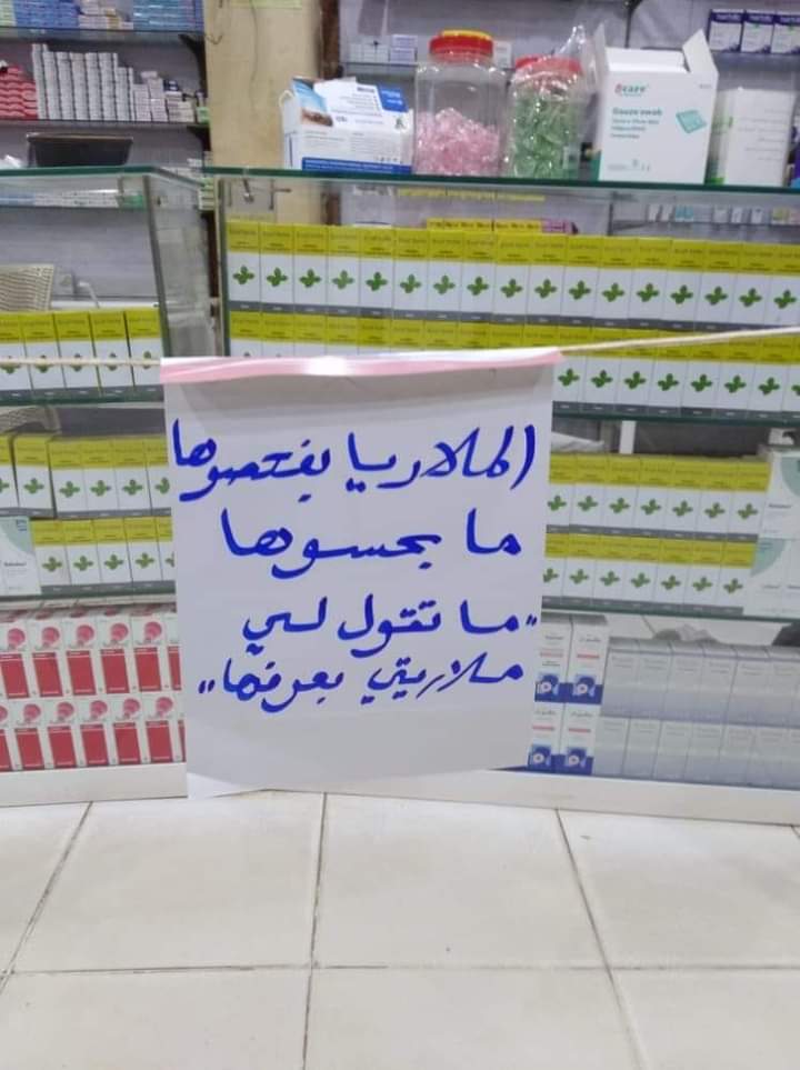 تداول رواد مواقع التواصل الإجتماعي صورة من داخل إحدى الصيدليات  تحمل في مضمونها رسالة توعوية وإرشادية لكل مواطن يأتي للصيدلية لشراء دواء للملاريا دون إجراء فحوصات تؤكد إصابته بها.