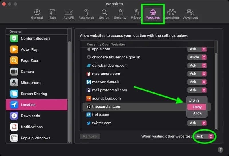 • في الجزء الأيمن من الشاشة، استخدم القائمة المنسدلة الموجودة بجوار كل موقع ويب لتغيير إذن الوصول إلى بيانات الموقع لكل موقع على حدى، حيث يمكنك الاختيار من بين الخيارات الثلاثة التالي: (السؤال) Ask، أو (الرفض) Deny أو (السماح) Allow.