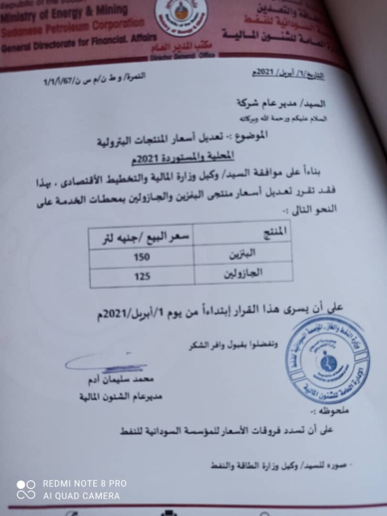 بينما تم تغيير سعر لتر الجازولين إلى (١٢٥) جنيهاً، حسبما أعلنت وزارة الطاقة، حسب منشور صادر عن مدير عام الشؤون المالية محمد سليمان آدم.