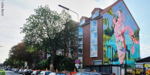 الفنانة التشكيلية الألمانية جوليا بنز قامت بتزيين الجدران الخارجية لمرسمها ومعرضها الدائم بمدينة هامبورغ الألمانية بجدارية عملاقة تتجسدها صورة امرأة سودانية ترتدي الثوب السوداني.