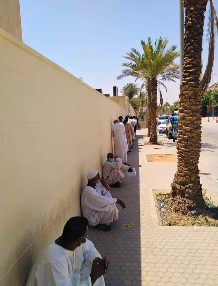 تداول مواقع التواصل الاجتماعي العملاق (فيسبوك) صورة لبعض السودانيين المقيمين بالعاصمة السعوديه الرياض وهم يقفون صفوفاً تحت الشمس الحارقة من أجل إستخراج جوازاتهم التي تأخرت السفارة السودانية في إستخراجها لهم.