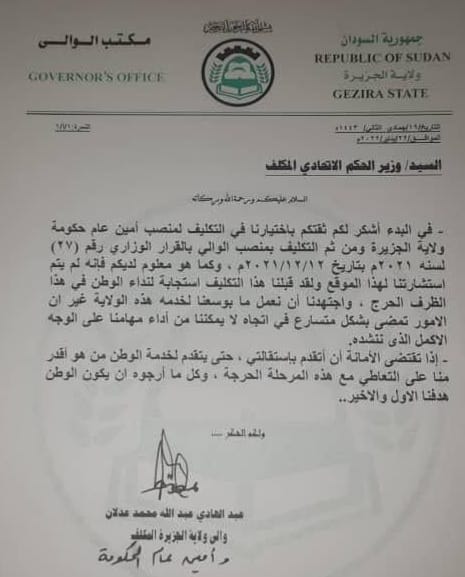 فى تطوُّرات جديدة للاحداث بولاية الجزيرة قدم الوالي المُكلّف استقالته من منصبه وفق صحيفة السوداني
