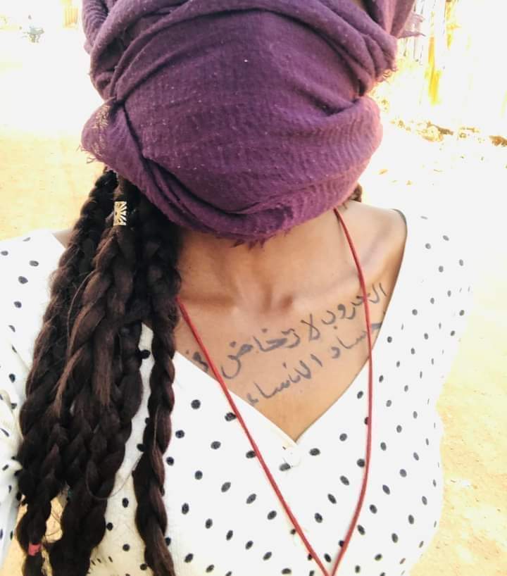 وبحسب متابعات محررة (كوش نيوز) فقد كتبت الفتاة “الحروب لا تخاض على أجساد النساء ” قد زينت بها الشابة نفسها وخرجت في إحدي المواكب تضامناً مع فتيات تعرضن لحالات إغتصاب.
