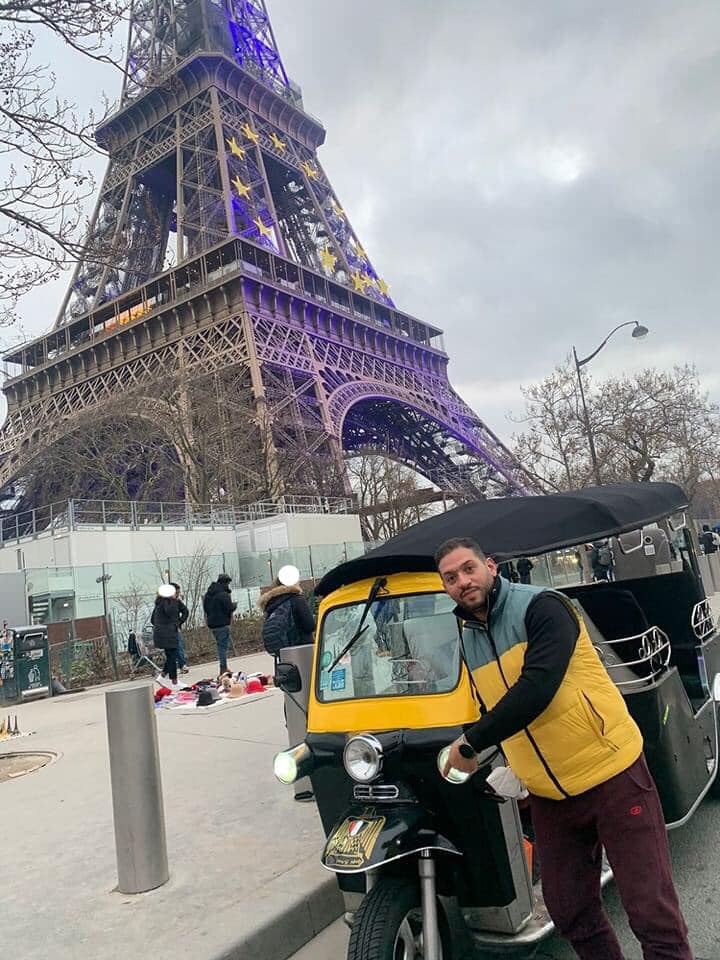 وأوضح أنه أثناء تجواله وجد “توك توك” مزيناً بالعلم المصري، ومع اقترابه للتعرف على صاحبه وجد شابا مصريا يعمل على توصيل السائحين في أحياء باريس من خلاله، ما دفعه لالتقاط صور تذكارية انتشرت على مواقع التواصل.