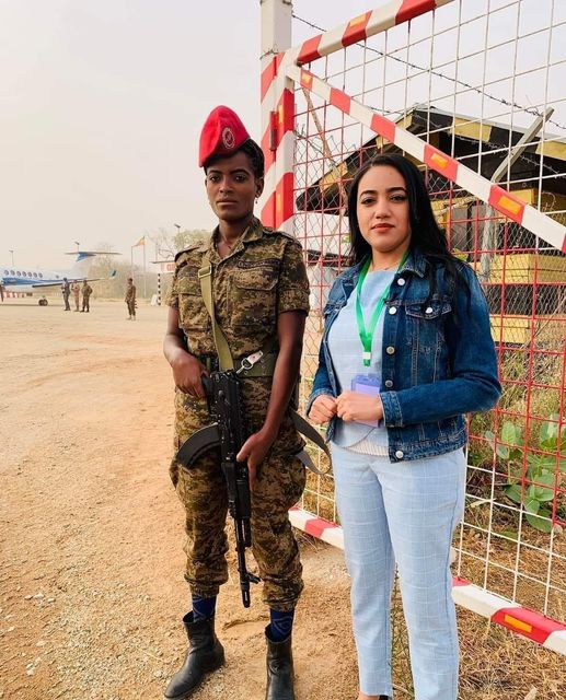 شاهد بالصورة.. بعد فترة من الغياب.. الإعلامية السودانية رفيدة ياسين تظهر بــ(البنطلون) وتحت حماية أمنية مشددة من إحدى حسناوات الجيش