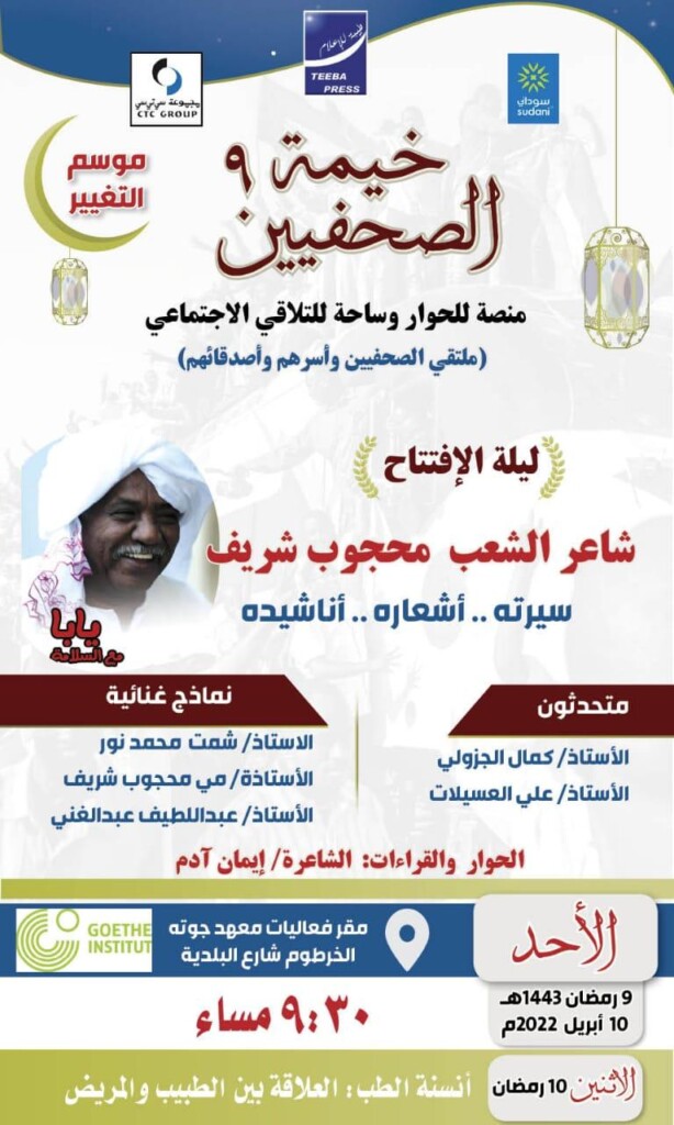 تنطلق اليوم الأحد بمركز جوته الألماني بالخرطوم، فعاليات خيمة الصحفيين بعد غياب بسبب جائحة (كورونا).