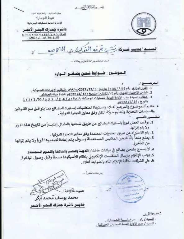 وشملت الضوابط الجديدة وفق صحيفة (الصيحة)، إيقاف العمل فوراً باستيراد البضائع عبر شحنها بالطبالي، وأن يتم الاستيراد عن طريق الحاويات المعتمدة وفق معايير التجارة الدولية، ومنع شحن الملابس المستعملة وسيتم إعادة تصديرها فوراً وعدم السماح بإنزالها من الباخرة، وعدم السماح بشحن البضائع في البرادات عدا الأدوية والخضر والفاكهة واللحوم المجمّدة، وإلزام المستورد بإرسال المنفست الإلكتروني بنظام الاسكودا مسبقاً وقبل وصول الباخرة.